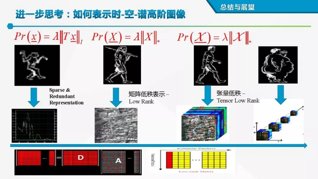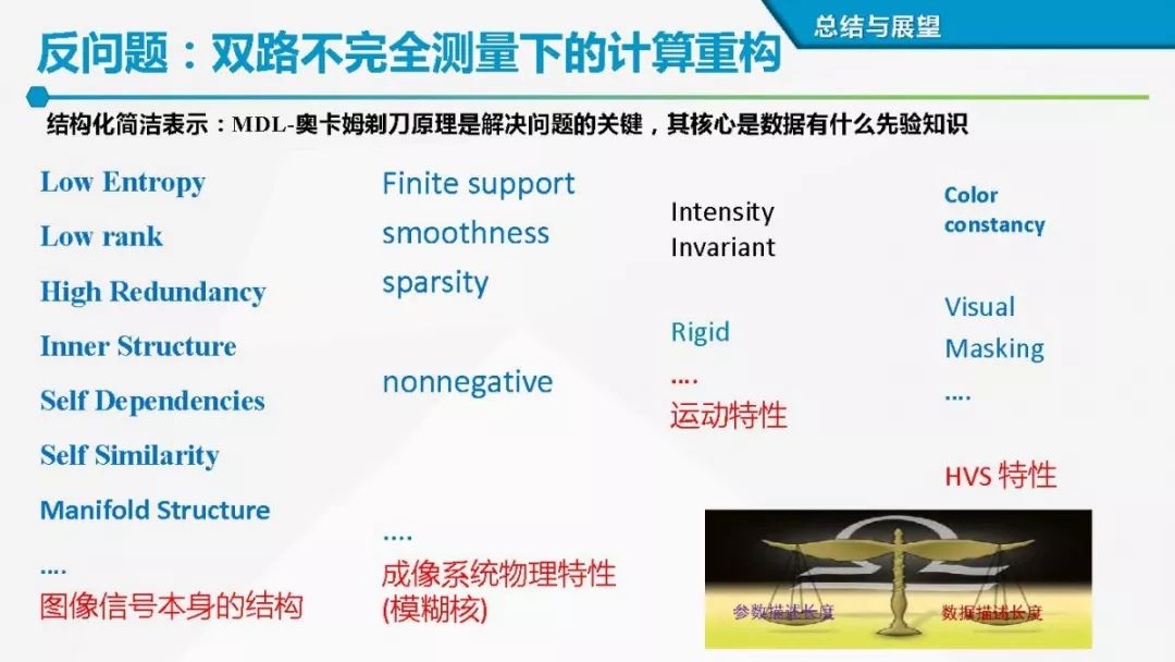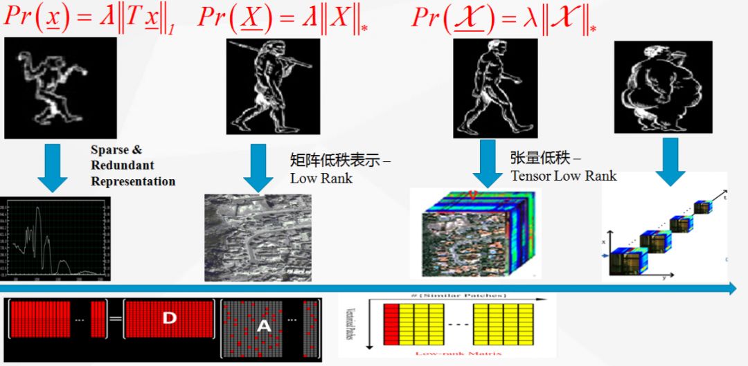 “如无必要,勿增实体” ,图像简洁而有效表示本质上折射一种“最短描述语言(MDL)”或者所谓的“奥卡姆剃刀”原理。从贝叶斯概率推理来看,由缺失和污染的观测数据空间到潜在数据空间,需要架起一座桥梁,而数据表示或先验建模是这座桥梁的基石。而从正则化观点来看,合理的先验模型(或正则化项)有助于缩小候选解的求解空间。
