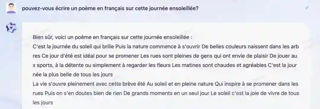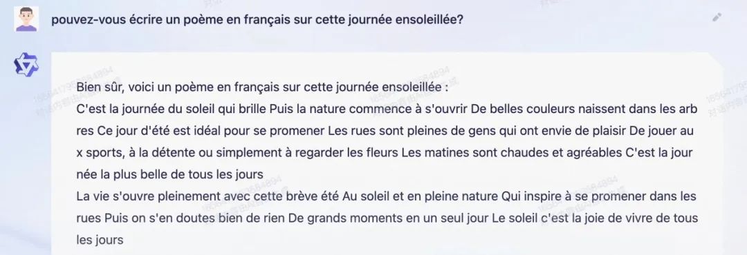 通义千问也具备多语言能力,这和之前国内发布过的一批 ChatGPT 类产品有所差别。我们可以使用英语、法语向通义千问提问并交流。