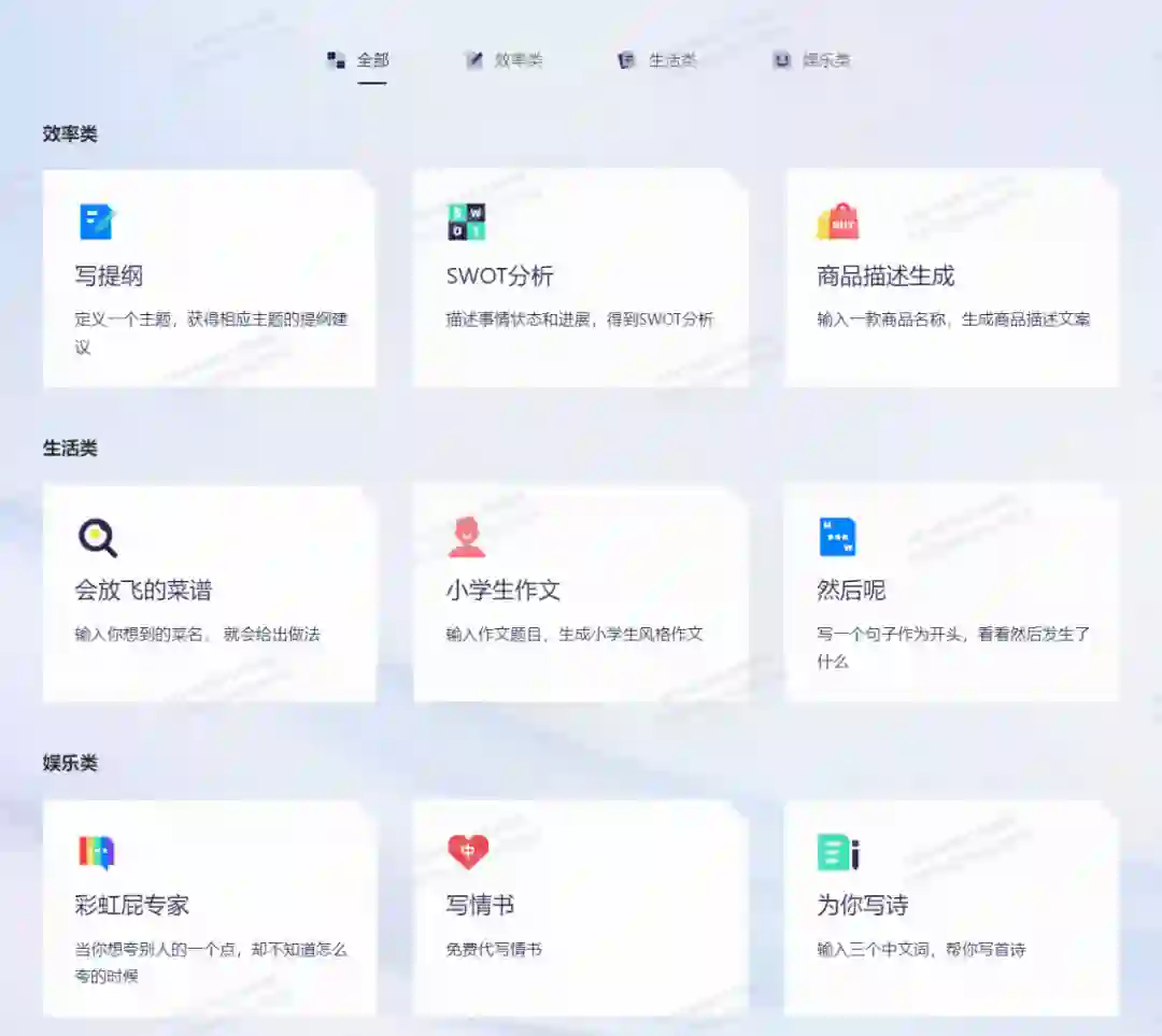 另外还有小应用集合「百宝袋」,其中包含特定任务的文本生成功能,如写提纲、菜谱、写诗等不同领域的生成。效果还不错,所以我们可以猜测,这是阿里通义千问为特定领域任务而定制的模块。