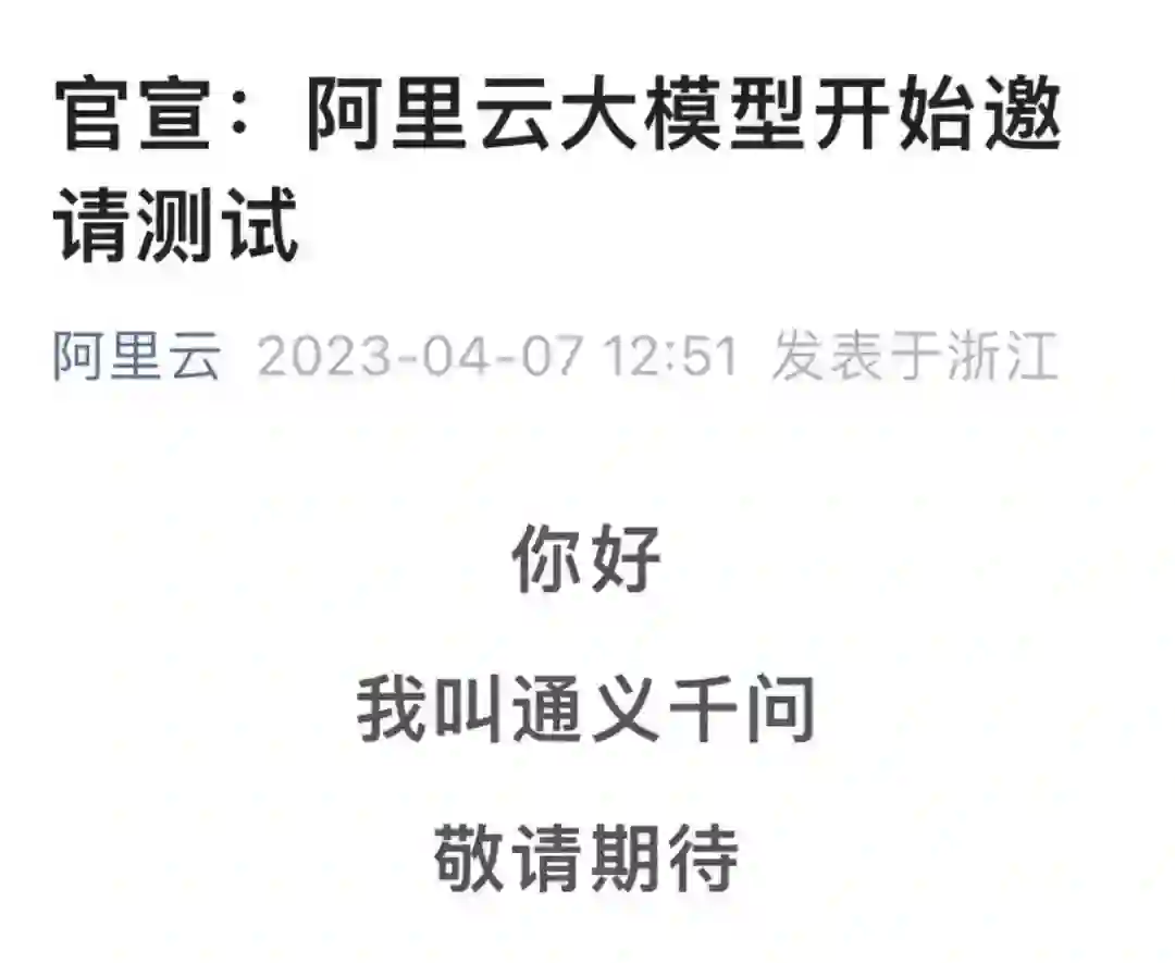 4 月 7 日下午,阿里云突然宣布自研大模型开启企业邀测,模型名为「通义千问」。