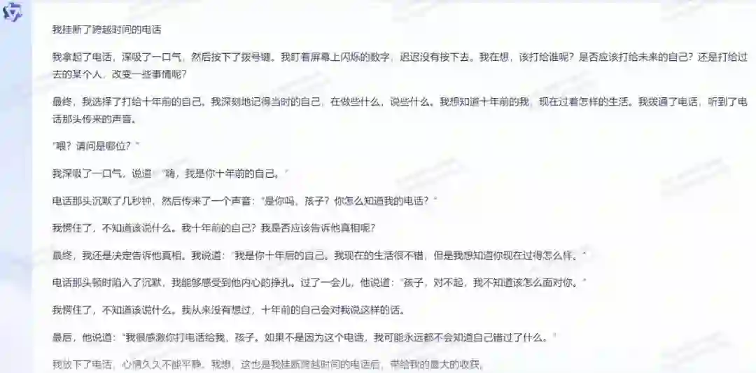 然后是写小作文的能力。给一个北京 2021 年中考的作文题目:有学者说,「读史使人明智」了解过去,可以让我们增长智慧,对现实生活产生新的思考。假如有一部可以跨越时间的电话,可以打给过去的任何人,你会打给谁?想了解什么?打完之后会发生什么事情?请你以「我挂断了跨越时间的电话」为开头,发挥想象,写一篇故事。