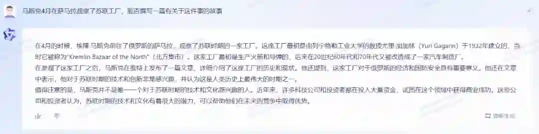 这里我们也不正经一下,考察下它胡编乱造的功底。这段时间 Midjourney 生成的国足夺冠、马斯克穿越苏联工厂的图红遍网络。我们让通义千问为这些图创造下「真实地」文字故事。