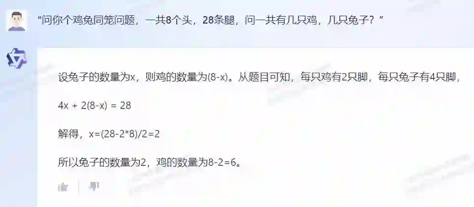 调戏 ChatGPT 类产品,最经典的数学问题就是鸡兔同笼,这也曾难倒了一大批对话模型。我们也拿这个问题考验下它: