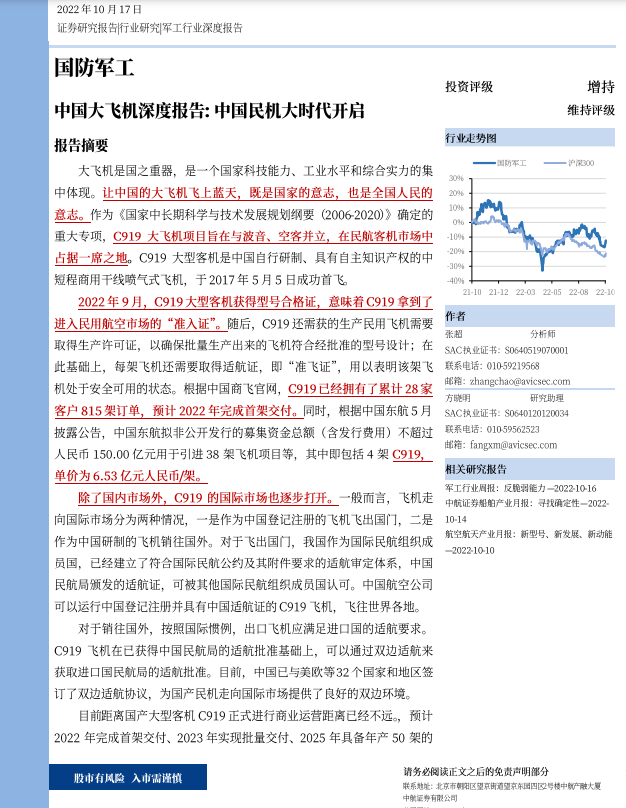 2022年9月,C919大型客机获得型号合格证,意味着C919拿到了进入民用航空市场的“准入证”。随后,C919还需获的生产民用飞机需要取得生产许可证,以确保批量生产出来的飞机符合经批准的型号设计;在此基础上,每架飞机还需要取得适航证,即“准飞证”,用以表明该架飞机处于安全可用的状态。根据中国商飞官网,C919已经拥有了累计28家客户815架订单,预计2022年完成首架交付。同时,根据中国东航5月披露公告,中国东航拟非公开发行的募集资金总额(含发行费用)不超过人民币150.00亿元用于引进38架飞机项目等,其中即包括4架G919,单价为6.53亿元人民币/架。
