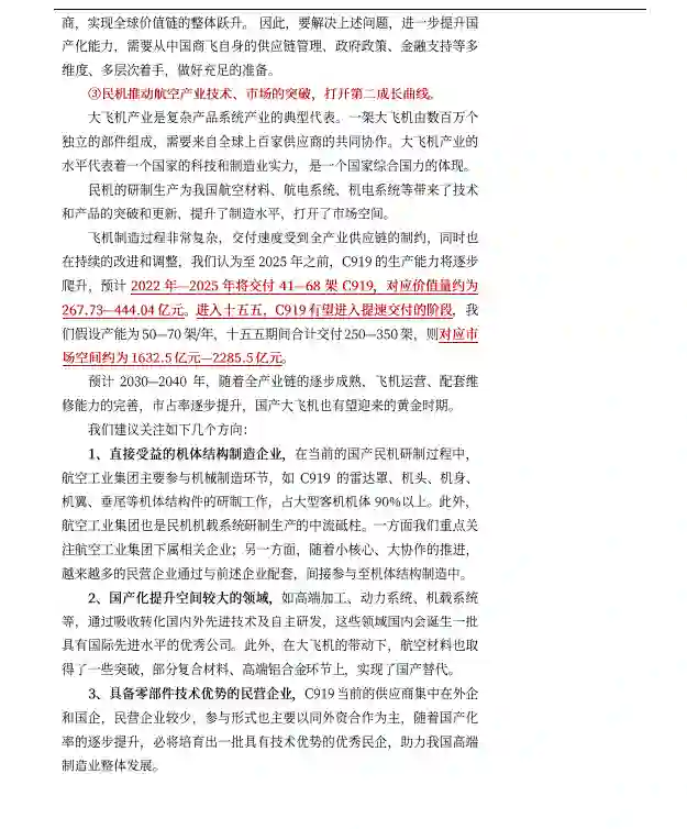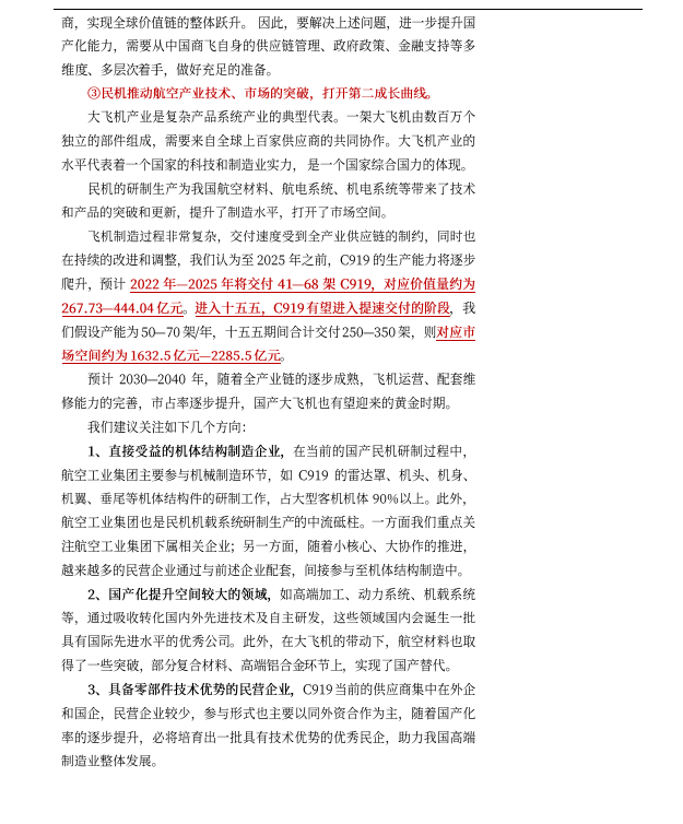 2、国产化提升空间较大的领域,如高端加工、动力系统、机载系统等,通过吸收转化国内外先进技术及自主研发,这些领域国内会诞生一批具有国际先进水平的优秀公司。此外,在大飞机的带动下,航空材料也取得了一些突破,部分复合材料、高端铝合金环节上,实现了国产替代。