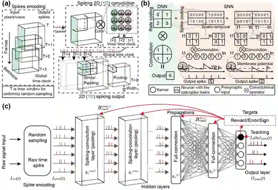 图1:脉冲卷积编码和奖赏传播算法。(a),脉冲卷积编码中的双时钟设计。(b), 脉冲卷积编码和人工卷积编码的对比差异。(c),结构依赖的奖赏传播算法用于多层SNN学习,含有卷积、前馈等多类型结构。