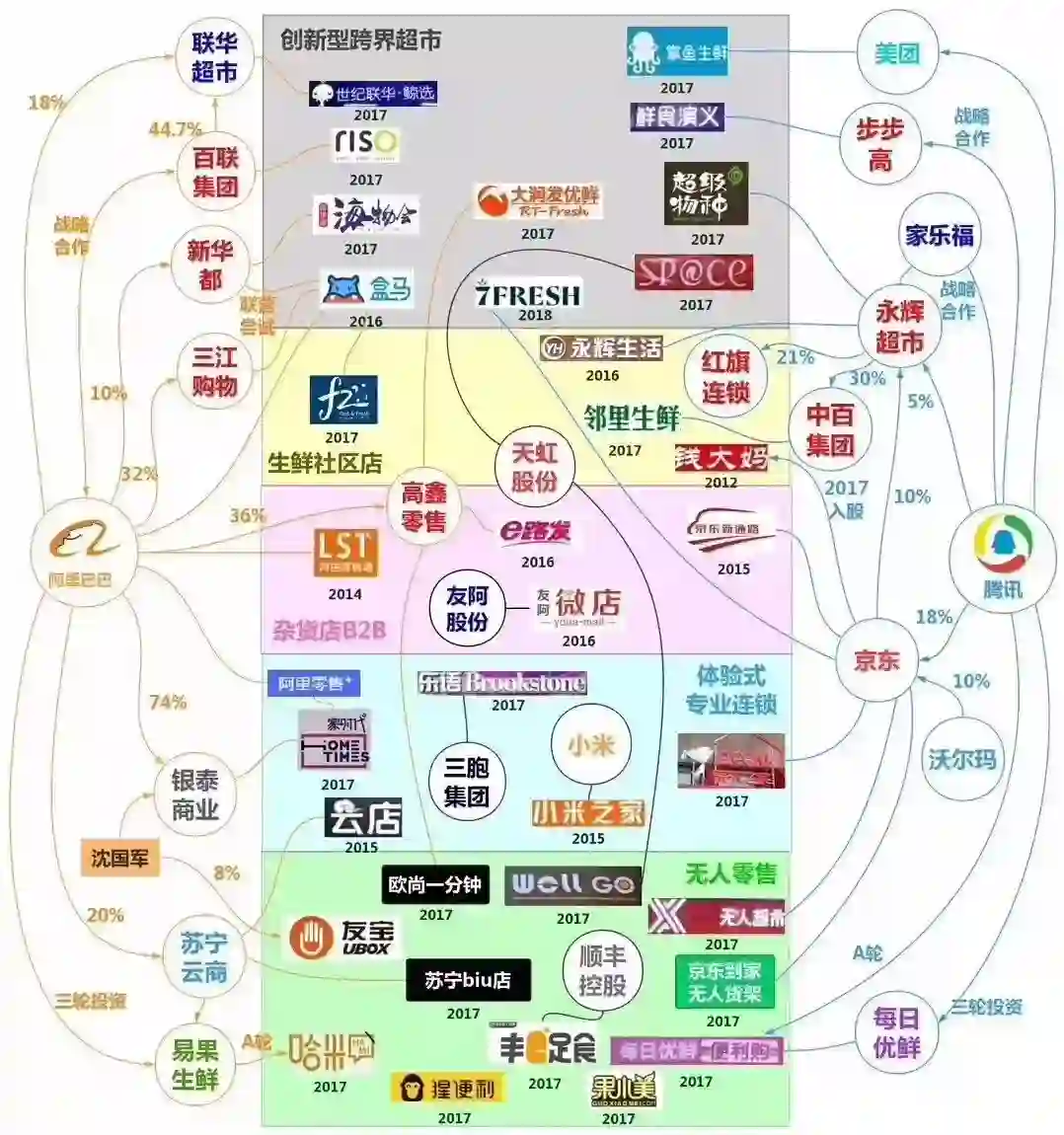 曾经百花齐放的新零售江湖,可以画出一张业务布局图谱。到现在才几年时间,图中涉及的这些品牌,有的在热潮退却后降低预期,有的因业绩下滑而收缩战线,甚至有好几家早已消失于风雨之中。