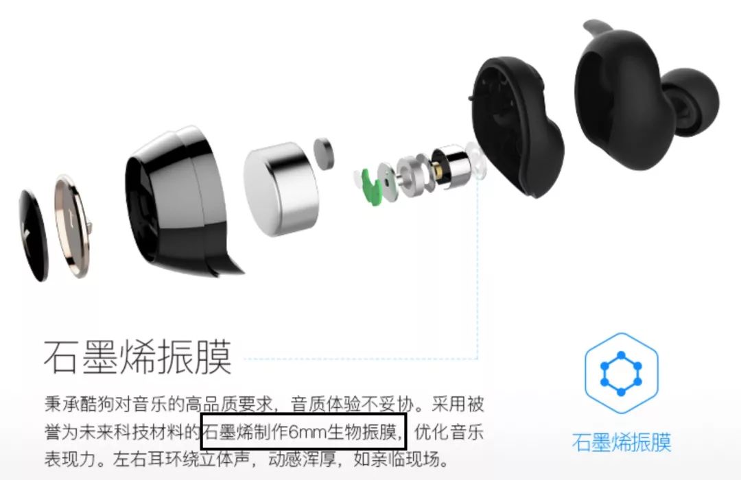 在查看酷狗 X5 的官方宣传图时发现,官方称其振膜为「石墨烯制作 6mm 生物振膜」,石墨烯什么时候和生物扯上关系了?我们都知道,石墨烯就是单层石墨,石墨也就是我们平常用的铅笔的那个头,与生物没有半点关系,那这个文案是怎么回事呢?