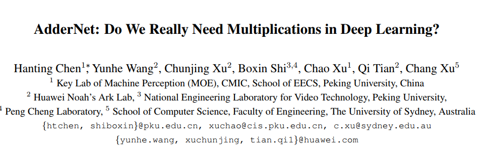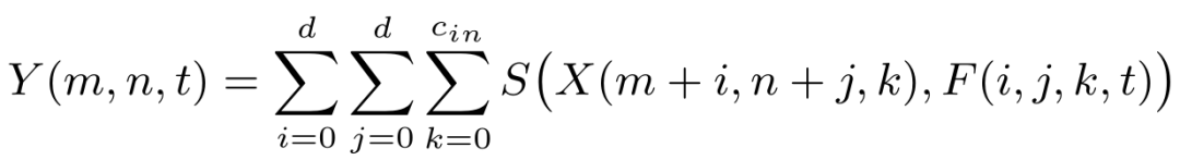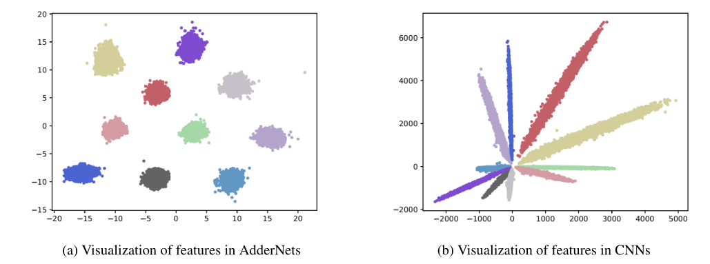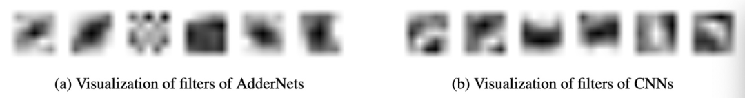 图 1. AdderNets 和 CNNs 中特征的可视化 模型介绍 给定一个深度神经网络的中间层,考虑一个滤波器 F,其中核大小为 d,输入通道为 c_in,输出通道为 c_out。输入特征定义为 X,令 H 和 W 分别为特征的高度和宽度,输出特征 Y 表示滤波器和输入特征之间的相似性,得到公式: