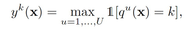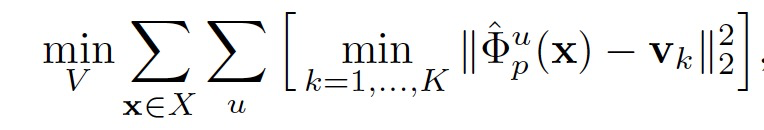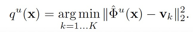 令Φ^(x) 表示输入图像 x 的特征图,Φ^u(x) 表示对应第 u 个位置的特征向量,对于每个位置 u,将相应的特征向量Φ^u(x) 赋给其最近的(以平方欧式距离为单位)视觉词嵌入 q^u(x):