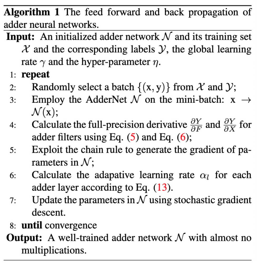 经典 CNN 中,作为输入特征映射中的值的加权和,卷积滤波器的输出可以是正的或负的,但是加法器滤波器的输出总是负的。因此,引入批量归一化将加法器的输出层规范化到一个适当的范围内,然后在所提出的加法器中使用经典 CNN 中使用的所有激活函数。尽管在批量规范化层中涉及乘法运算,但其计算成本明显低于卷积层,可以省略。 模型训练 神经网络利用 BP 反向传播计算滤波器的梯度,利用随机梯度下降更新参数。在经典 CNN 中,输出特性 Y 相对于滤波器 F 的偏导数计算为: