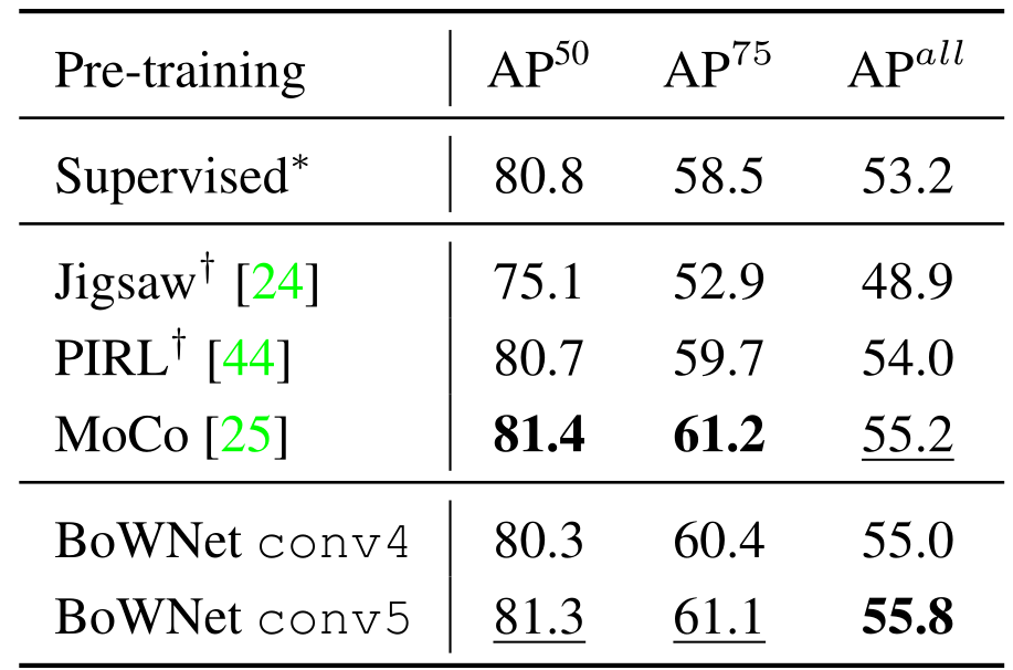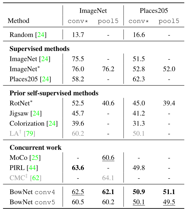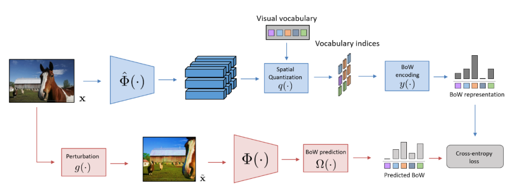 y(x) 是一个 k 维向量,其中第 k 个元素 y_k(x) 编码第 k 个视觉词在图像 x 中出现的次数。结果 y(x) 可以被看作是图像 x 的第 K 个视觉词的软分类标签。K 值可能较大,因此 BoW 表示 y(x) 是相当稀疏的。 第三步,基于提取的 BoW 表示,执行自监督任务:给定图像 x,使用扰动算子 g(·) 生成扰动图像 x˜=g(x),然后训练模型基于扰动图像 x˜「预测/重建」原始图像 x 的 BoW 表示。本文使用的扰动算子 g(·):包括(1)颜色抖动(即图像的亮度、对比度、饱和度和色调的随机变化);(2)以概率 p 将图像转换为灰度;(3)随机图像裁剪;(4)比例或纵横比失真;(5)水平翻转。 定义一个预测层Ω(·),该预测层以Φ(x˜)作为输入,输出 BoW 中的 K 个视觉词的 K 维 softmax 分布。该预测层通过 liner-plus-softmax 层实现: