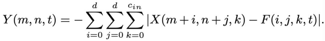 其中,S(·,·)表示预定义的相似性度量。如果使用互相关性作为距离度量,即 S(x,y)=x×y,则上式为卷积运算。此外,还有许多其他的度量能够用来测量滤波器 F 和输入特征 X 之间的距离。然而,这些度量中的大多数涉及乘法运算,具有较高的计算成本。因此,本文作者使用加法测量距离。L1-norm 距离计算的是两个矢量表示的绝对差之和,它不包含乘法运算。此时,相似性计算公式为: