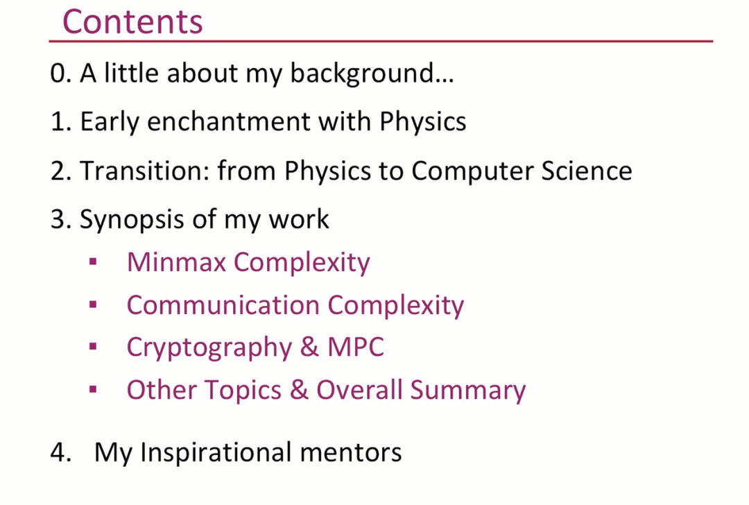 接下来,我想要介绍三个主题,极大极小算法 (min max complexity),通信复杂度 (communication complexity),以及密码学和 MPC。