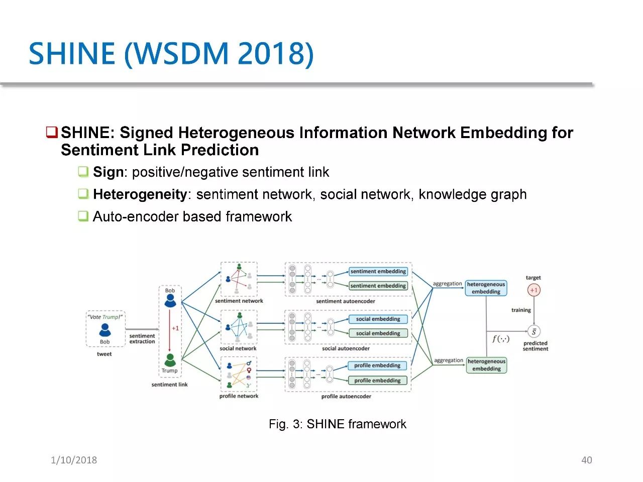 第二个应用是 SHINE,这篇论文发表于 WSDM 2018。它的目的在于预测微博用户对名人明星的情感。我们提出了一种基于自编码器的框架,这个框架其实类似于 SDNE,将它应用于三者并加以结合进行情感预测。