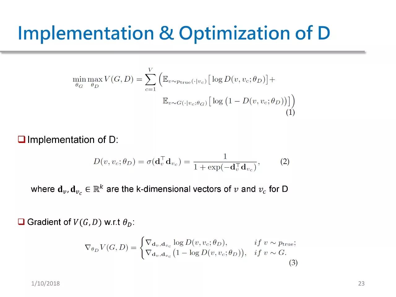 下面来看生成器的实现和优化。在 GraphGAN 中,我们选了一个非常简单的生成器,生成器 D(V, VC) 就是一个 sigmoid 函数,它先将两者的 embedding 做内积,再用 sigmoid 函数进行处理。对于这样的实现,它的梯度自然也较为简单。