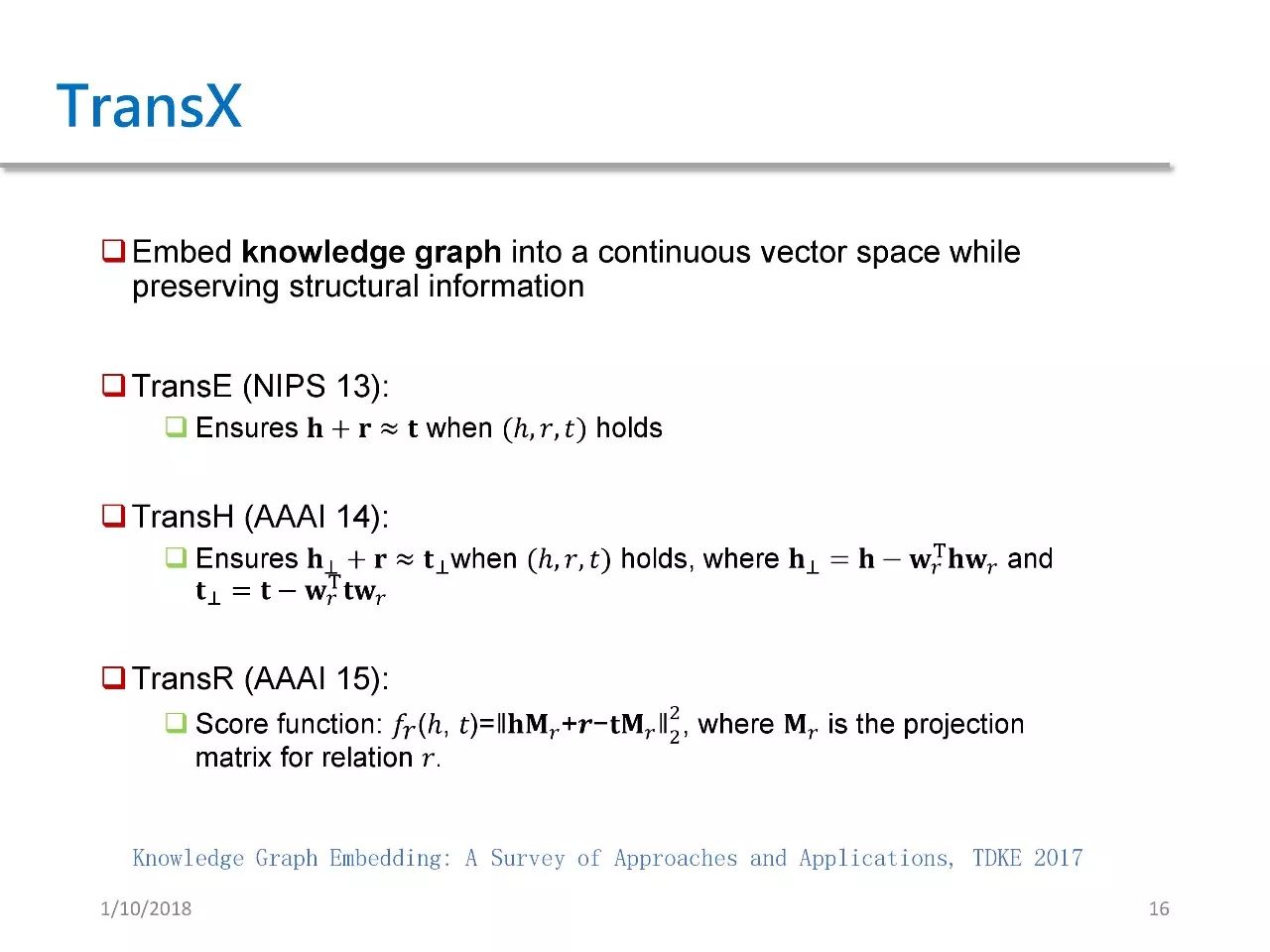 TransX 表示一系列方法,X 可以指代任何字母,这些方法都是基于 KG embedding。KG embedding 是指将 KG 中的每个 entity 和 relation 都映射到一个低维连续空间中,并且保持原来的图结构信息。比较经典的方法有 TransE、TransH 和 TransR,统称为基于翻译的方法。
