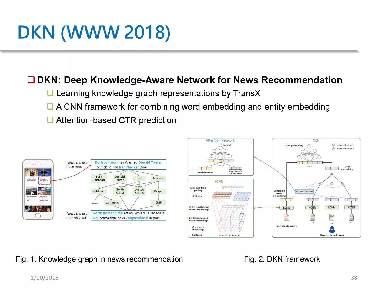 DKN 是我们发表在 WWW 2018 上的论文,它提出了一个可用于新闻推荐的 deep knowledge-aware network。在 DKN 中,我们将 KG 中的 entity embedding 和 word embedding 在一个 CNN 框架中加以结合,并且提出了一种 attention based 点击率预测模型。