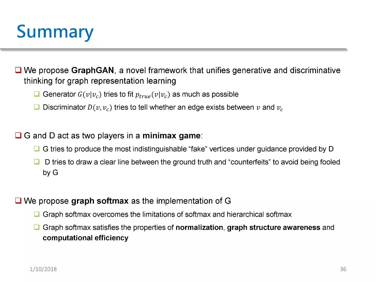 随后,他还以第一作者的身份,为大家解读了上海交通大学、微软亚洲研究院和香港理工大学在 AAAI 2018 上发表的工作:GraphGAN: Graph Representation Learning with Generative Adversarial Nets。该工作引入生成对抗网络(GAN)的框架,利用生成器和判别器的对抗训练进行网络特征学习。