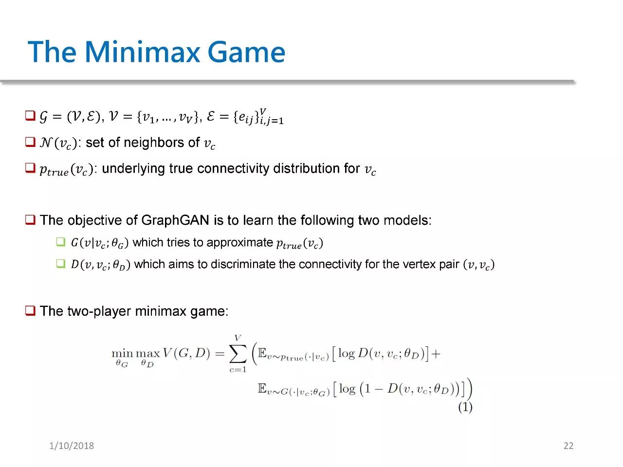接下来为大家介绍 Mnimax Game。其中 V 是节点集合,E 是边集合,我们将 N (Vc) 这个记号定义为 Vc 在图中的所有邻居,将 Ptrue (Vc) 定义成 Vc 的真实的连续性分布。
