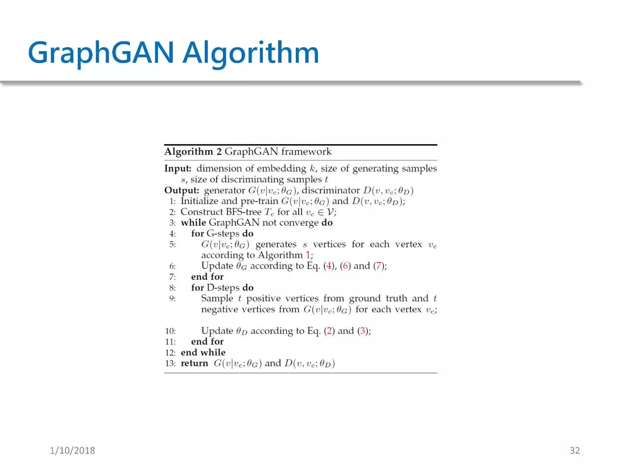 GraphGAN 的算法如上,输入是一些超参数,我们想输出生成式模型 G 和判别式模型 D。第 3-12 行是算法的每一次迭代过程。在每一次迭代过程中,我们都重复用生成器来生成 s 个点,并用这些点来更新 θG 的参数。