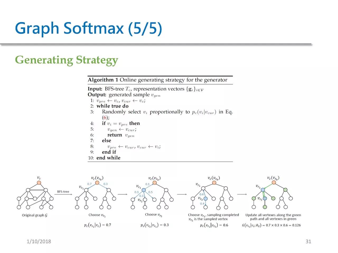 在 GraphGAN 中,我们的目标是设计出一种 softmax 方法,让其满足如下三个要求。第一个要求是正则化,即概率和为 1,它必须是一个合法的概率分布。第二个要求是能感知图结构,并且能充分利用图的结构特征信息。最后一个要求是计算效率高,也就是 G 概率只能涉及到图中的少部分节点。