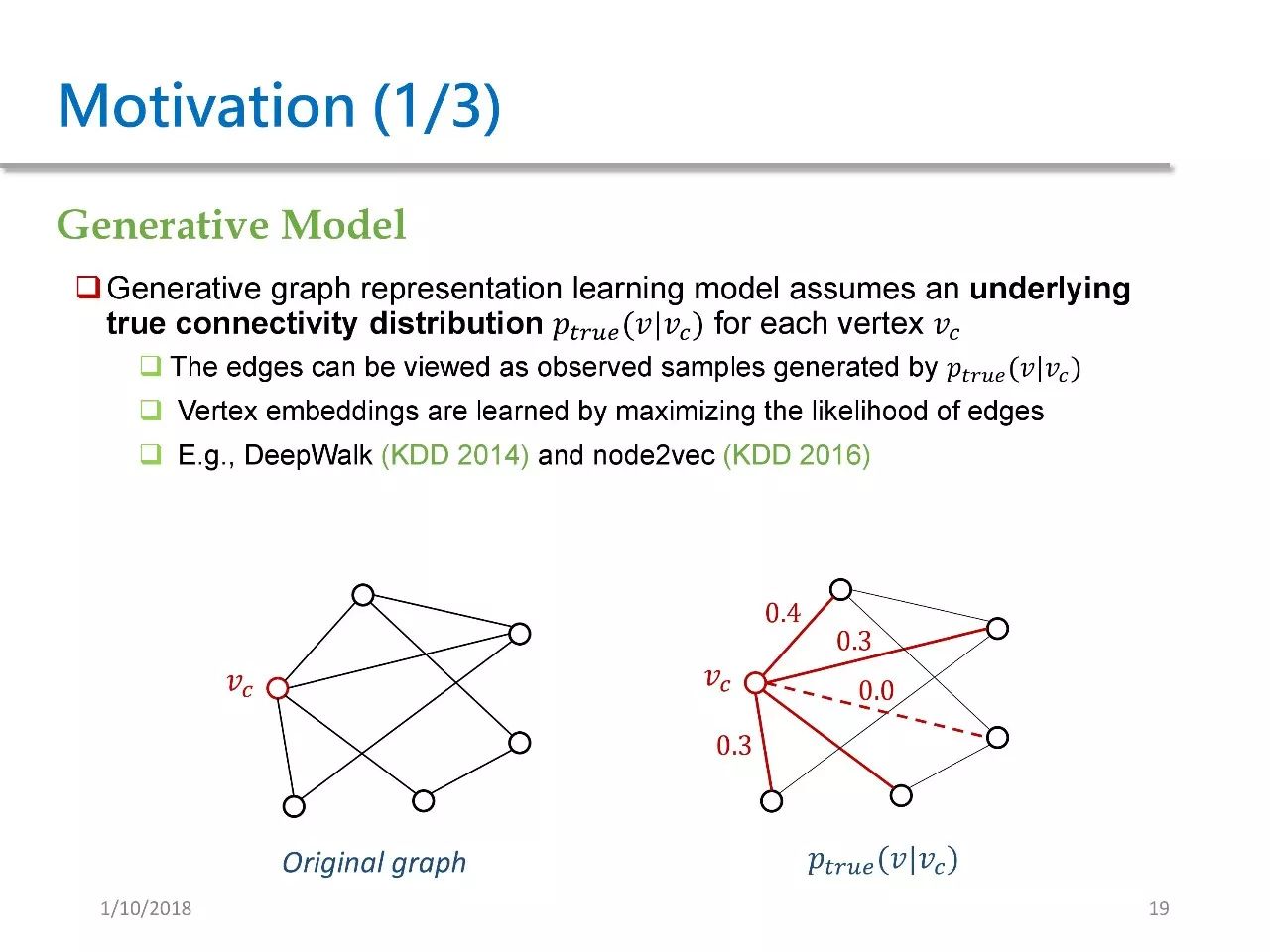 假设图中对于每个 Vc 都有这么一个分布,那么图中的每条边都可以看作是从 Ptrue 里采样的一些样本。这些方法都试图将边的似然概率最大化,来学习 vertex embedding。我们之前提到的 DeepWalk 和 Node2vec 都属于生成式模型。