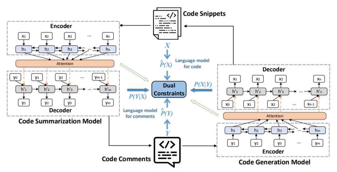 ,从而设计了一种正则项来约束对偶性。更直观而言,这种「对偶性」表示代码生成任务的输入"意图"同样是代码总结的输出,反之亦然。其中意图指开发者写这一段代码的目的,一般而言会通过注释的方式用自然语言表达。