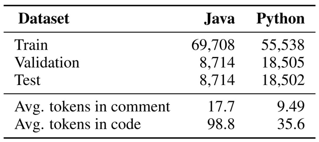 论文表 1,我们可以看到,训练集有 5 万到 7 万段代码,且确实一段 Python 代码平均长度要远远少于 Java 代码。