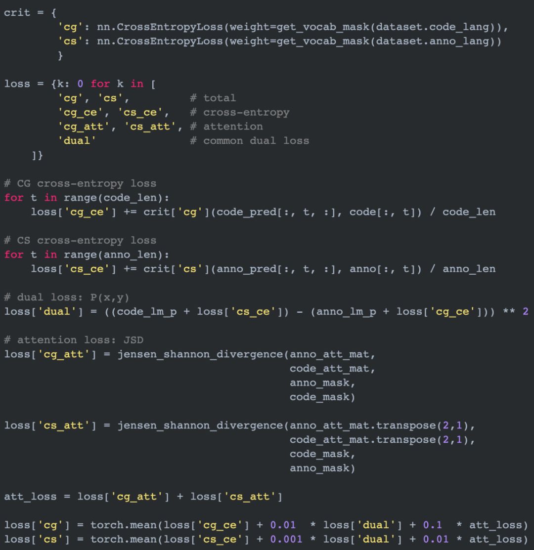 对偶损失函数,它度量的是代码与注释的概率相关性;