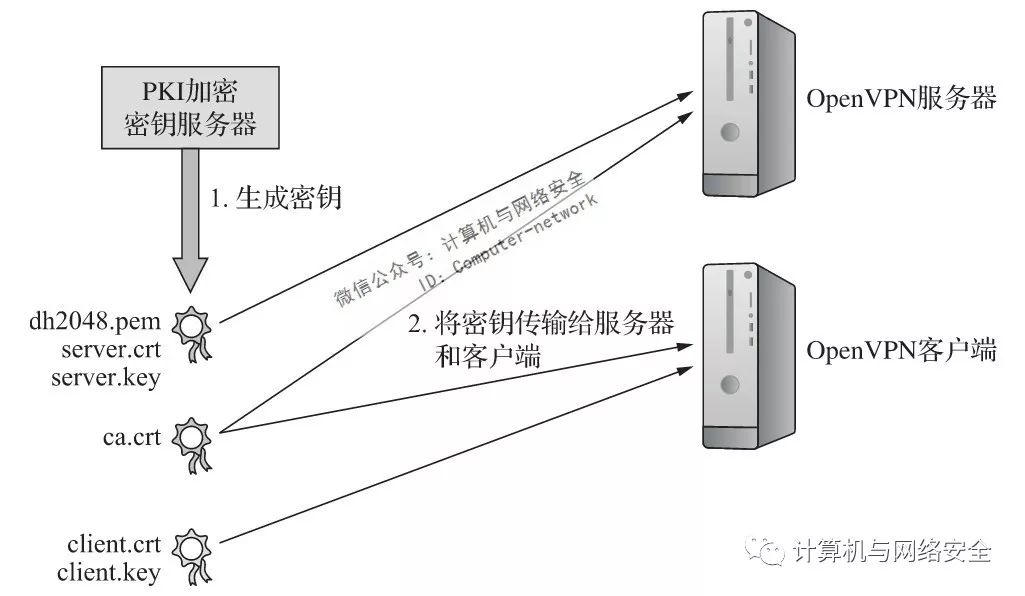 简单起见,将在运行OpenVPN服务器的同一台机器上设置密钥基础设施。然而,安全最佳实践中常常建议在产品级部署中使用一台独立的CA服务器。无论何种情形,图2都可以说明为OpenVPN应用生成和分发加密密钥资源的过程。