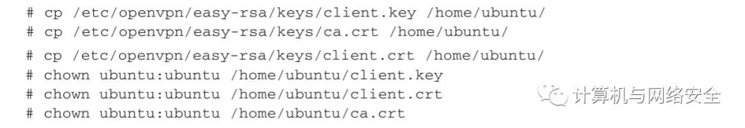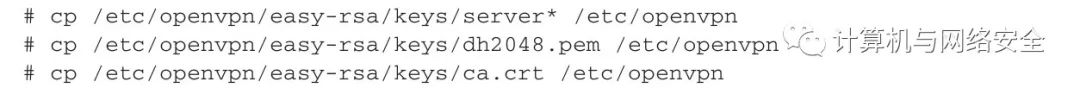 现在,服务器端的密钥将被写入/etc/openvpn/easy-rsa/keys/目录,但是OpenVPN并不知道这些。OpenVPN默认在/etc/openvpn/目录下进行查找,因此,要将它们复制过去,操作如下:
