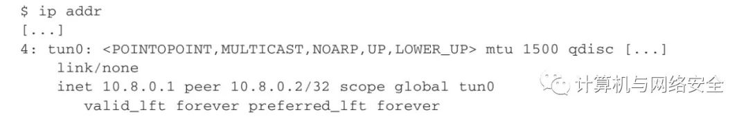 现在,运行ip addr命令列出服务器的网络接口,将包括一个对tun0新端口的引用。这是由OpenVPN为传入的客户所创建的: