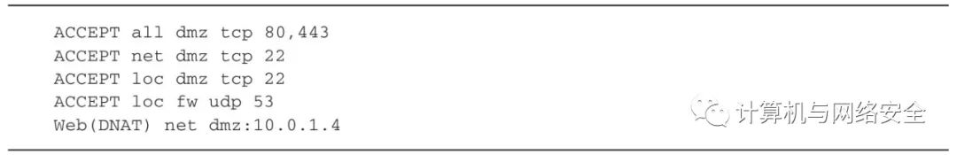 一旦已有完整的计划,在本例中就是用DMZ设置对这些运行的服务器进行分类,应该设置一个严格的默认策略。