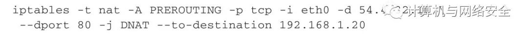 下一条规则将被添加到NAT表(-t nat)中。它使用TCP协议来处理所有通过eth0接口的流量,该接口针对应用程序的(虚拟)公共IP地址(54.4.32.10),并指定要使用HTTP 80端口。满足这些条件的任何流量都将被重新路由到DMZ(192.168.1.20)中Web服务器的互联网地址: