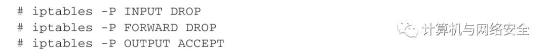 以下这些规则构成了防火墙的基准,在所有接口上,阻止(DROP)所有的传入及转发流量,但允许传出流量: