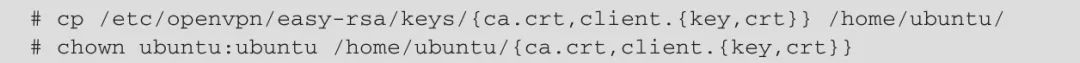 这两个客户端文件和仍保存在keys/目录中的原始ca.crt文件将安全地传输到客户端。鉴于它们的所有权以及权限,这可能有点复杂。最简单的方法是将源文件的内容手动复制到桌面上运行的终端中,之后再登录到客户机的第二个终端上将其粘贴到所创建的同名新文件中。