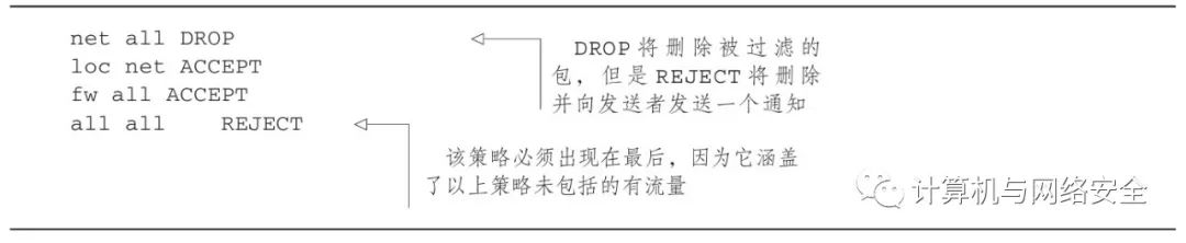 policy文件建立默认基准行为。图11中,第一行将默默地删除从互联网(net)到任何目的主机的所有流量。第二行允许从私有区域(loc)传出到互联网的流量,这使得本地计算机可以接收软件更新。第三行表明源自防火墙的流量在任何地方都应被接收。最后一行拒绝任何不包含在其他规则中的包。