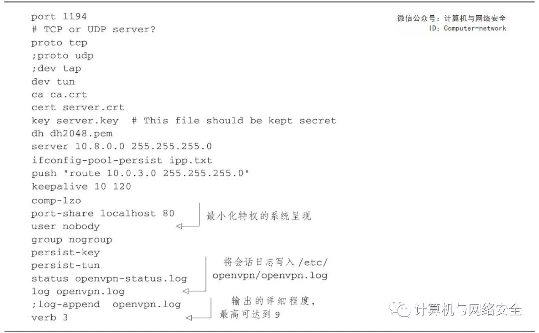 图4 /etc/openvpn/server.conf文件中的一些有效设置