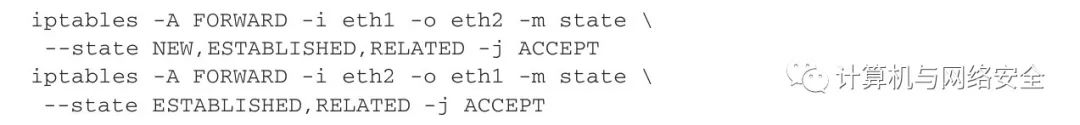 希望本地网络中的设备能够与DMZ中面向公众的服务器进行通信,包括该路由器本身。在Filter表中为FORWARD链添加的两条规则将允许数据包在eth1及eth2接口所连接的网络之间移动(FORWARD)。-A参数表明其后的内容应该被添加为一条新的规则。这使得DMZ中的Web