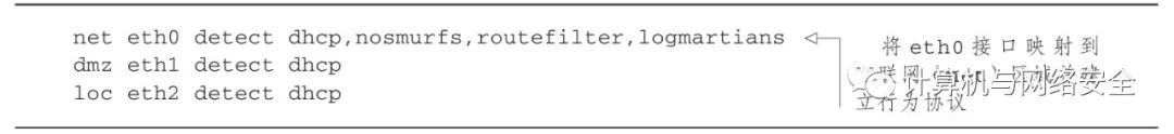 现在,需要创建一个名为interfaces的文件,在该文件中将每个新的区域与连接到shorewall服务器的三个网络接口中的某一个进行关联,如图10所示。detect命令让shorewall明白,想自动检测网络配置;dhcp意味着通过DHCP服务器为网络接口自动分配IP地址。在接入互联网的接口上,nosmurfs、routefilter以及logmartians将过滤可疑的包、源端域以及与日志相关的事件。