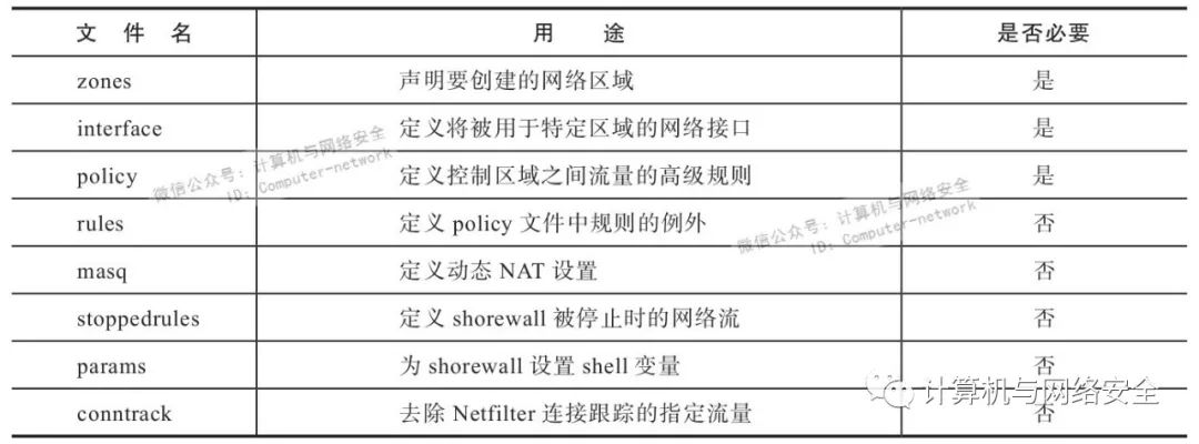 即使three-interfaces选项看上去与我们正在规划的非常匹配,但是,我们要从头将所需的东西组合在一起,以便能够清晰、准确地了解该过程如何工作。表3简要描述了/etc/shorewall/目录中会使用的文件。