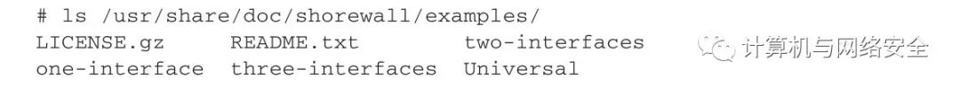 虽然shorewall启动选项是由/etc/default/shorewall文件控制的,但是,防火墙配置本身通常是由/etc/shorewall/directory目录中的一组文件处理的。/etc/shorewall/shorewall.conf设置运行shorewall所需要的shell环境。对于简单的项目,甚至可能不用触及该文件或参数,以及将会在那里发现的一系列连接跟踪(conntrack)文件。然而,将需要创建一些其他文件,可用的模板在/usr/share/doc/shorewall/examples/目录中(或者,对于CentOS操作系统是/usr/share/doc/shorewall-5.0.14.1/Samples目录,其中5.0.x是版本号)。如果列出了examples/目录下的内容,将会看到四个子目录,依次包括涵盖一组普通场景的示例配置文件: