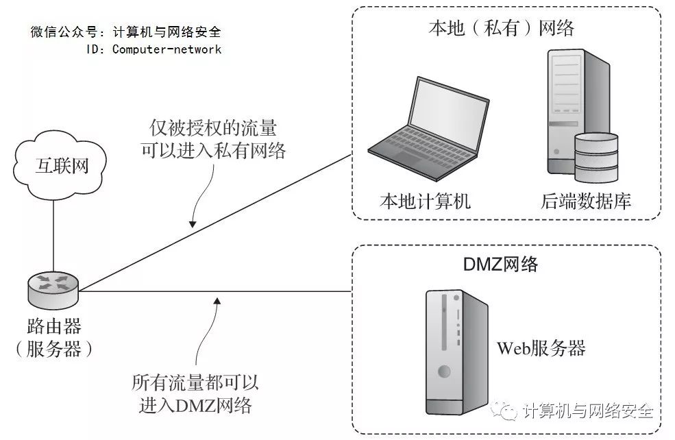 一个流行的隔离体系结构是非军事区(Demilitarized Zone,DMZ)(用以描述两个互不信任的国家之间的地理缓冲地带)。该想法是,将服务器、工作站、WiFi