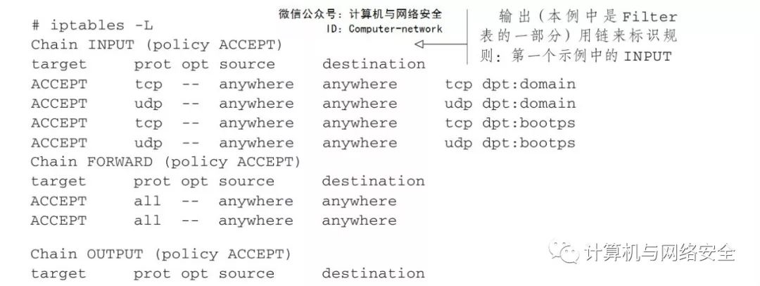 ● 即使最终使用了诸如Shorewall等更为简单的解决方案,在iptables本身所在的位置快速浏览其内容也仍然是一个好做法。这通常有助于加深对Linux