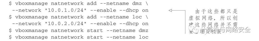 第一步,将使用vboxmanage命令行工具(为DMZ配置创建网络)。natnetwork add命令通知VirtualBox想添加一个新的NAT网络。在第一个示例中,netname是一个dmz区,子网是10.0.1.0/24。第二个网络被命名为loc(本地),其子网为10.0.2.0/24。创建了这些网络后,就可以用natnetwork start命令启动它们了: