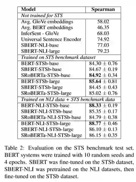 • 在SNLI和NLI数据集上pre-train,不进行fine-tune,直接计算cos相似度,使用spearman计算cos相似度和标签的相关性,因为标签是离散值,而预测的时候使用的是回归模型,因此需要计算其相关度,论文中说普通的相关度计算不太好,使用Spearman是比较不错的选择