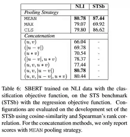 事实证明,采用各种Pooling方式其实对SBERT的性能影响不大。而改变拼接方式影响较大,普通的(u,v)拼接的性能很差,最重要的一部分是|u-v|,毕竟分类的输出很依赖与计算两个Embedding的差异度