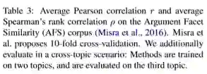 • AFS语料库包括了关于gun control, gay marriage, 和death penalty三个主题的一系列辩论观点,其标注了一对辩论观点的主题是否相同(0-完全不同的主题,5-完全相同的主题),作者在论文中说,由于AFS的相似度判断不仅仅是观点类似,还需要是理由也类似,而且AFS的用词和语句表达跟SNLI差距很大,因此直接使用pre-train的Embedding计算相似度效果不太好。