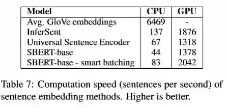 由于Transformer的并行性,因此虽然在CPU上SBERT的表现不太好,但是在GPU上还是不错的。当然直接使用GloVe的效率是显而易见的(直接进行向量运算即可)。Smart batching是说通过将长度相似的句子分为一组,这样在mini-batch中就只需要padding到最长的长度,可以减小padding token的计算开销。